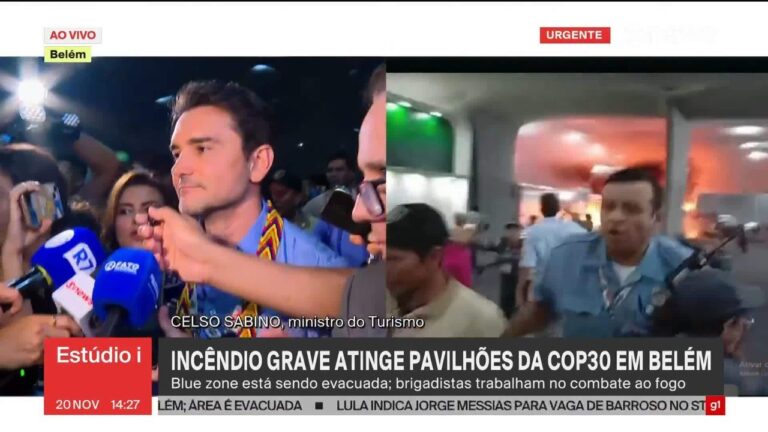 Não há feridos no incêndio na COP, diz ministro do Turismo O ministro do Turismo, Celso Sabino, disse nesta quinta-feira (20) que