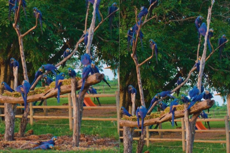 No vídeo, o azul intenso das araras se mistura ao verde da vegetação do Pantanal, destacando a riqueza natural do bioma. Segundo