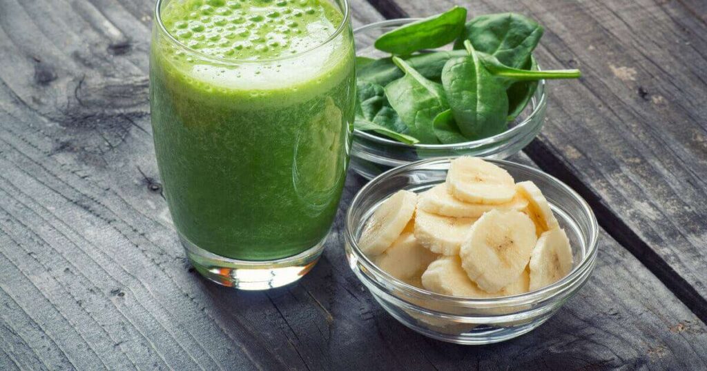 Em um liquidificador, coloque as folhas de espinafre, a banana, a água e bata até obter uma consistência homogênea. Transfira o suco para um copo, adicione as pedras de gelo e sirva em seguida.