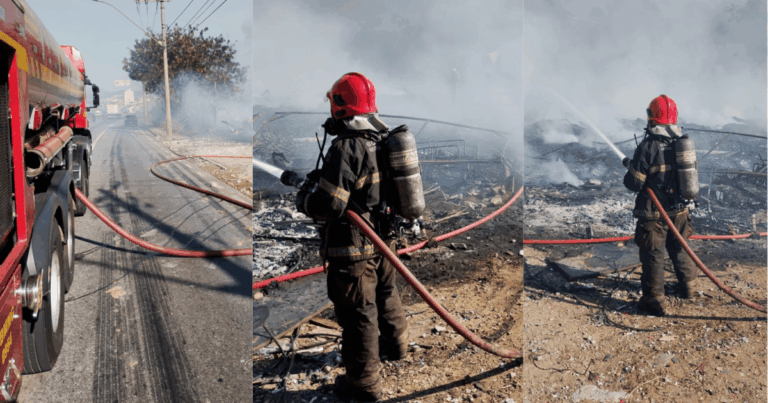 O galpão de recicláveis que pegou fogo e liberou uma fumaça tóxica na manhã desta sexta-feira (14) em Contagem, na Região Metropolitana