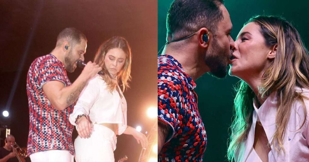 Diogo Nogueira foi a atração do Clube do Samba neste domingo (17). De folga das gravações da novela “Vale Tudo”, onde interpreta a alcoolista Heleninha Roitman, Paolla Oliveira subiu ao palco e fez a temperatura subir com muitos beijos e troca de carícias com o marido.