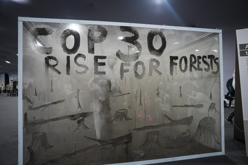 Belém, 18 de novembro de 2025 – O artista brasileiro Mundano, em parceria com o Greenpeace, apresentou uma impactante instalação artística nos corredores da COP30, em Belém, para exigir que os líderes mundiais tomem medidas ousadas em prol das florestas.  Com cinzas provenientes de incêndios florestais ocorridos em 2024 da Terra Indígena Anambé, no Pará, Mundano formou a frase: ‘COP30: Levante-se pelas Florestas’. A ação teve apoio do WWF.
