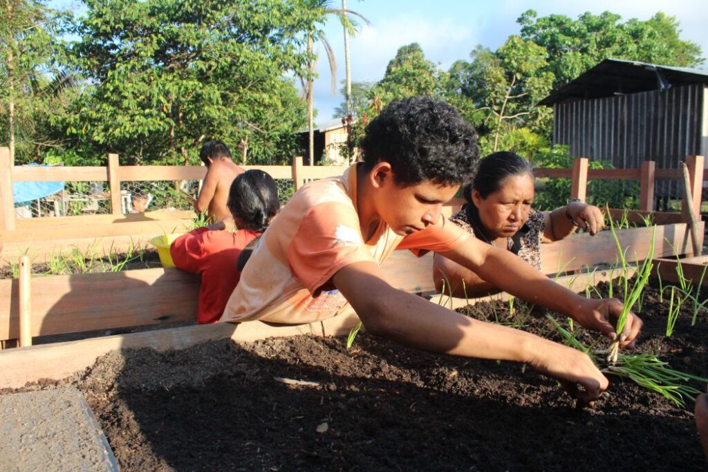 Os canteiros receberam sementes de cebolinha, tomate, pimenta de cheiro, coentro, couve e chicória, além de mudas de frutíferas como açaí. Também foram fornecidos insumos, ferramentas e materiais necessários para proteger e cuidar das hortas. Todo o planejamento foi feito em diálogo com as comunidades, respeitando a cultura e as preferências alimentares locais.