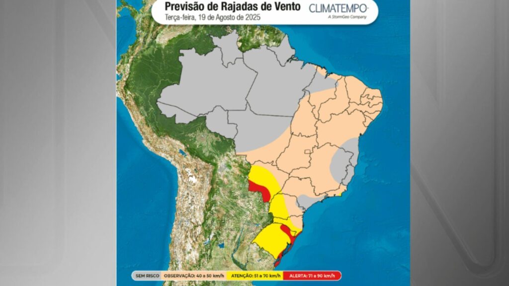 Os ventos ganham força no decorrer do dia, com rajadas de até 70 km/h no interior gaúcho e de até 90 km/h no leste e litoral gaúcho. O destaque segue entre o noroeste, missões, região central, fronteira oeste, campanha e sul gaúcho, onde há risco para temporais com volumes mais expressivos e acompanhados por granizo já nas primeiras horas do dia.