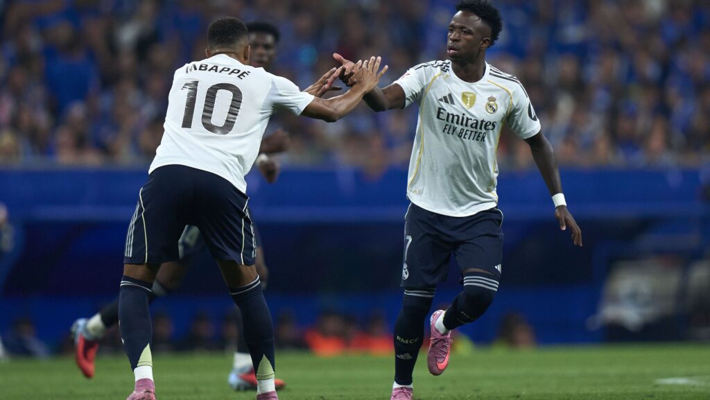 Mbappé e Vini Jr marcam, Real Madrid vence Oviedo e segue 100% em LaLiga