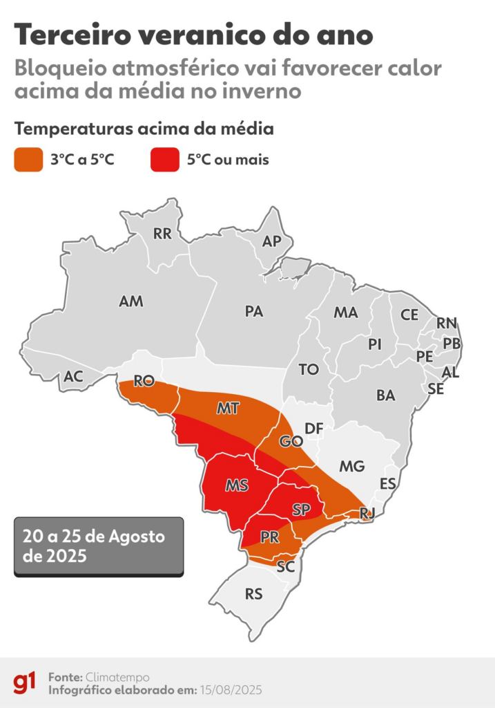 Segundo os meteorologistas, ele ganha força a partir de terça-feira (19), quando o calor deve se espalhar pelo Centro-Oeste, Sudeste e até por áreas do Sul. A expectativa é de temperaturas acima da média de agosto e, por consequência, um ar ainda mais seco do que o visto nos últimos dias.